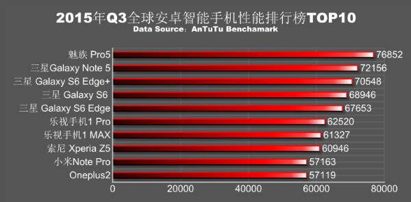 الهاتف الجديد "Meizu Pro 5" يتربع على عرش أسرع الهواتف في العالم بحوالي نقطة ، ثم يليه أربعة أجهزة من سامسونج ، وهم بالترتيب التالي ، سامسونج جلاكسي نوت 5 ، غلاكسي اس 6 ايدج بلوس، جلاكسي اس6 و اس6 ايدج . ولكن تذكر أن الجهاز من الشركة المصنعة الصينية يحتوي على شاشة 1080P،على عكس بقية الأجهزة الاخرى ، التي تأتي مجهزة بشاشات 1440P .